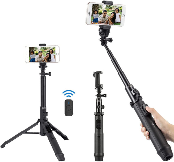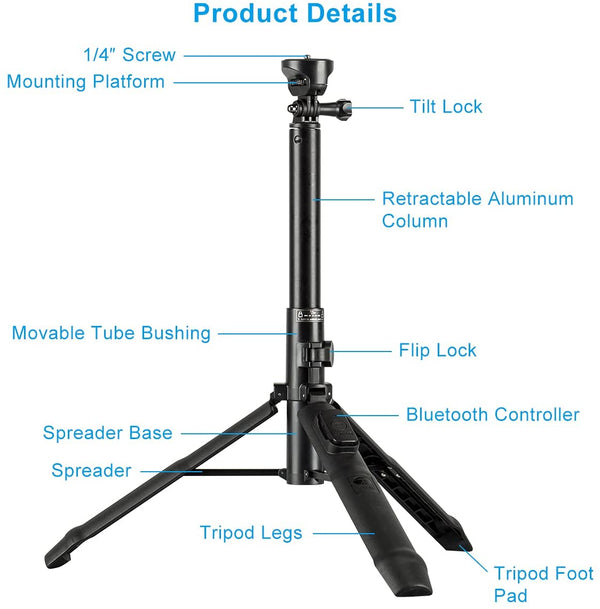 Key Features Table Top Tripod with telescopic function – 5 sections extendable – Compact and versatile selfiestick – Feet serve as handle when folded down Removable Smartphone clamp with 1/4″ thread connection – Smartphone clamp with 1/4″ thread and cold shoe Bluetooth remote control for iPhones (with Lightning charging socket, cable not included) Pipe clamp for attaching to tripod leg or other pipes – Tilt function one-dimensional’ with 1/4″ screw High-quality workmanship made of metal and plastic with carbon look