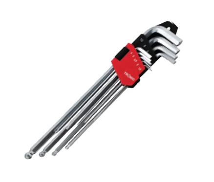 Tronic Spherical Head Allen Key HT HK29 is an L-shaped metal bar with a hexagonal head at each end, used to turn bolts and screws having hexagonal sockets. This Tronic key 9 piece set is available in sizes ranging from 1.5mm to 10mm