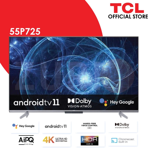TCL 55 Inch Android QLED 4K/UHD LED TV –(55P725) Key Features Display Size: 55 Inches Display Type :LED Ultra High Definition: Yes Resolution: 3840×2160 (4K Quality ) HDR 10+: Yes Dolby Vision IQ: Yes RAM: 2GB ROM: 16GB CPU: 64 -bit A55x4 1.3GHz GPU: G31x2 800MHz Operating System :Android Built In :Chrome Cast , Netflix, YouTube,Stan Power Consumption (TV On) :380W Bluetooth :5.0 HDMI Inputs: 3 USB Slots: 2 Ethernet : Yes Wifi : Yes Audio Output :24W 1 Year Warranty