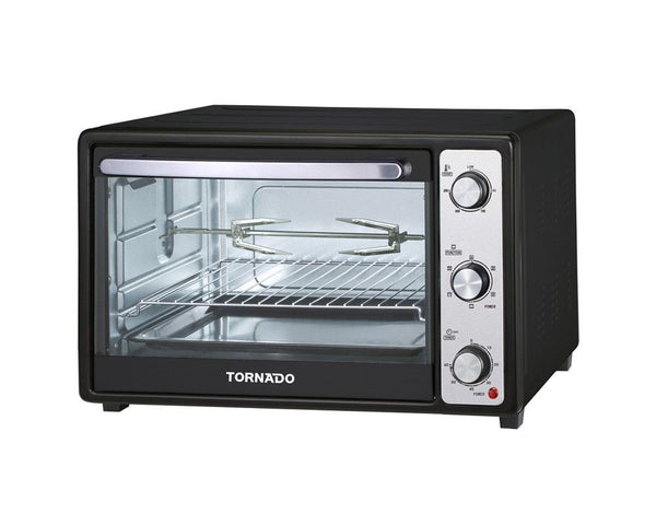 Tornado TEO-48DGE(K) 48 Ltrs Electric OTG Oven – 1800 Watt, Thermal Load Function, With Roast Function, 6 Levels to Control Oven Functions Key Features; Capacity: 48 Liter Electric oven power: 1800 watt Convection Fan To Distribute Heat Inside The Oven Thermal Load Function With Roast Function 6 Levels to Control Oven Functions Control The Temperature From 65ْ to 250ْ 4 Stainless Steel Heating Elements Timer up to 60 Minute Double Glass Door Stainless Steel Control Panel Upper Stainless Steel Holder With Interior Lighting With Wire Rack Tray Handle Rotisserie Fork Rotisserie Rod Rotisserie Handle Crumbs Tray
