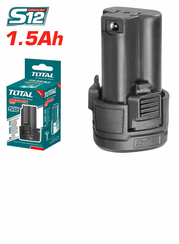 Total TBLI12152 Lithium-ion battery pack 12V Key Features: Volts: 12V Battery: Lithium-Ion 1.5Ah battery Compatibility: One battery fits all S12 multiple tools Packaging: Packed by color box