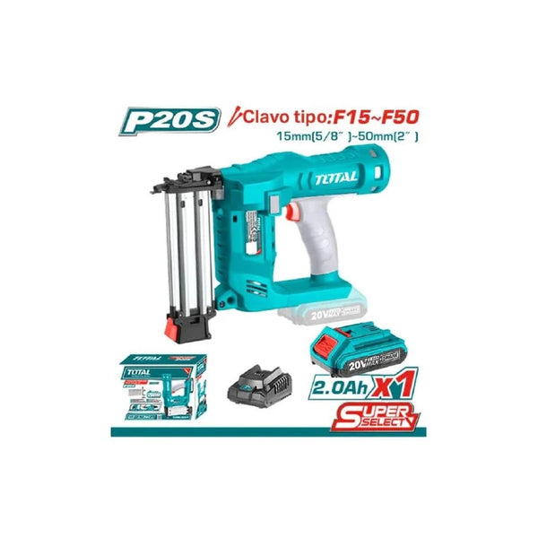 TOTAL TCBNLI2016 Lithium-ion Cordless Brad Nailer Kit Key Features Voltage: 20V Included Components: 1 pc 20V 2.0Ah battery (TFBLI2001) 1 pc charger (TFCLI2001E) Nail Type: F15~F50 Suitable For: TAC918151, TAC918201, TAC918251, TAC918301, TAC918351, TAC918381, TAC918401, TAC918501 Drive Rate: 2.5 nails/s Magazine Capacity: 100 pcs Ramp Up Time: 80ms