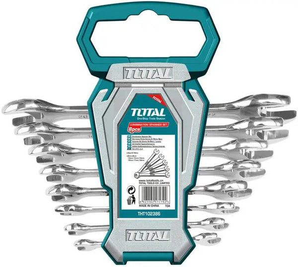 Total THT102386 Double open end spanner set Key features: 8pcs double open end spanner set Size: 6-22mm Sizes included: 6x7mm, 8x9mm, 10x11mm, 12x13mm, 14x15mm, 16x17mm, 18x19mm, 20x22mm Fine polished Packed by: plastic hanger