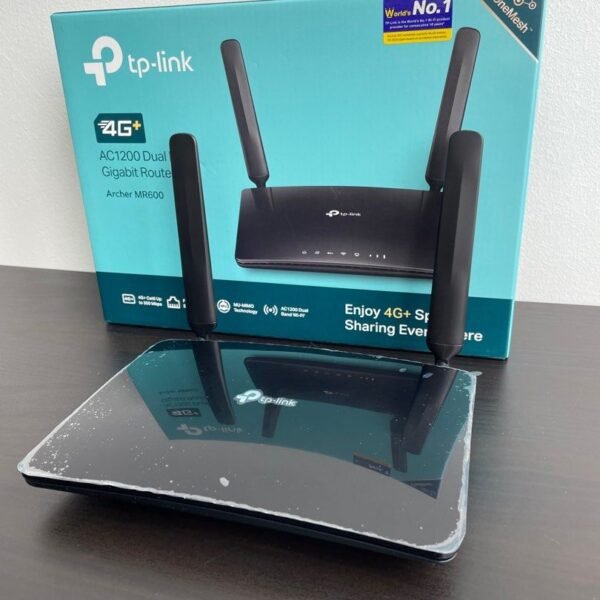 The TP-Link 4G+ Cat6 AC1200 Wireless Dual Band Gigabit Router – TL-ARCHER MR600 is a powerful and versatile networking solution designed to deliver high-speed internet access through both 4G LTE and dual-band Wi-Fi. With support for download speeds of up to 300Mbps on the 2.4GHz band and 867Mbps on the 5GHz band, this router can provide a combined wireless speed of up to 1200Mbps, making it ideal for homes and small offices that require reliable connectivity for multiple devices. Its two detachable external antennas enhance both 4G LTE and Wi-Fi signal strength, ensuring broader coverage and improved performance. Additionally, the TL-ARCHER MR600 features four Gigabit LAN ports for stable wired connections, a user-friendly management interface accessible via the TP-Link Tether app, and robust security protocols, including WPA/WPA2 encryption. With advanced features like Quality of Service (QoS) for bandwidth prioritization and Guest Network support, this router offers an excellent blend of performance, security, and ease of use, making it an outstanding choice for seamless internet connectivity.