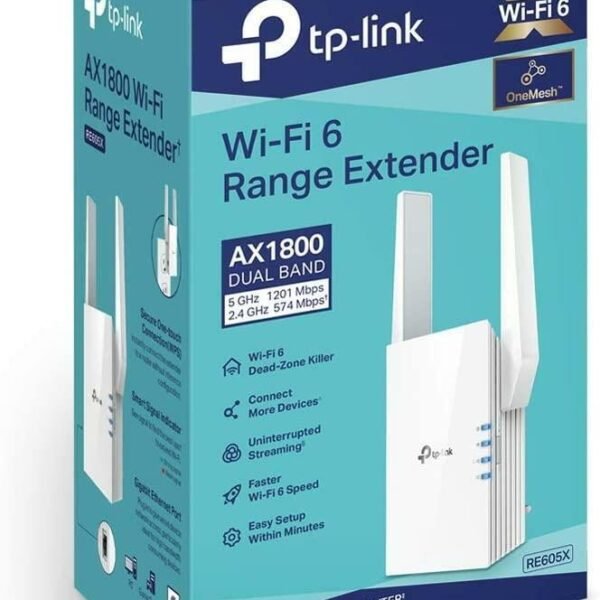 The TP-Link AX1500 Wi-Fi Range Extender – TL-RE505X is a high-performance solution designed to extend and enhance your Wi-Fi coverage using the latest Wi-Fi 6 technology. It offers combined speeds of up to 1500 Mbps, with 300 Mbps on the 2.4 GHz band for basic web browsing and 1201 Mbps on the 5 GHz band for more bandwidth-intensive activities like 4K streaming, online gaming, and video conferencing.