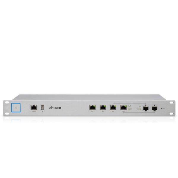 The Ubiquiti UniFi Gateway Pro (USG-PRO-4) is a high-performance router designed for advanced network management and security in enterprise and business environments. This device is equipped with four ports—one WAN port for internet connectivity and three Gigabit LAN ports for high-speed local network access. Additionally, it features a Gigabit SFP port for flexible fiber connectivity, enhancing its versatility.
