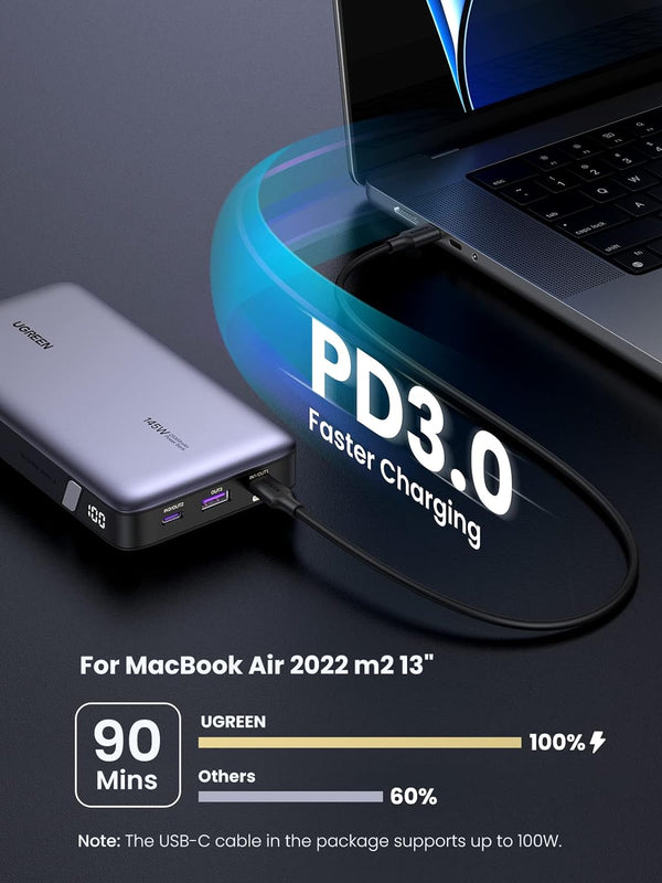 UGREEN PB205 25000mAh 145W Two-way Fast Charging Power Bank (UG-90597A) – USB C 3-Port PD3.0 Battery Pack Digital Display, Compatible with MacBook Pro, Laptop, iPhone 15/14/13/12 Series, Samsung, AirPods, and More Key Features: 145W Fast Charging: Equipped with PD3.0,QC3.0, and capable of 145W of fast charging speed! Fully charge a 2022 13″ Macbook Air in 90 minutes. 25000mAh Gigantic Capacity: Ugreen’s portable charge power bank comes with a massive 25,000mAh battery and a total power output of 145W! Completely recharge laptops up to 1.3 times and mobile devices up to 5.6 times. Two-Way Fast Charging: Easily recharge this 25,000mAh power bank in 2 hours with a 65W PD charger (not included). With our bi-directional technology, fast charge devices while fast recharging this portable charger. Smart Digital Display: LED digital display shows remaining power bank battery. Know exactly how much power is in portable power bank so you can step out with confidence. Wide Compatibility: The portable charger is compatible with MacBook Pro, MacBook Air 2022, Dell XPS 15/13, HP Spectre, iPad Pro, iPhone 15/iPhone 15 Plus/iPhone 15 Pro/iPhone 15 Pro Max, iPhone 14/14 Pro/14 Pro Max/13/12, Galaxy S23/S22/S21, Switch, DJI Mini 3 Pro,Steam Deck and More. Note: For the first usage after receiving it, please drain the power bank first and then fully recharge it without interruption.