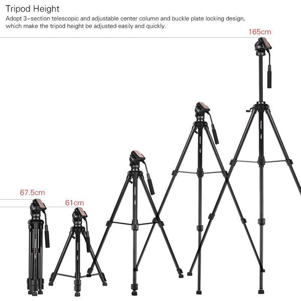 Yunteng VCT 880 Portable Aluminum Alloy Tripod Camera Stand Max Working Height: 165cm / 64.96in Min Working Height: 61cm / 24in Folded Height: 67.5cm / 26.57in Max Load Capacity: 5kg / 11lb Max Tube Diameter: 26.8mm / 1.06in Item Weight: 2080g / 73.4oz Package Size: 57.5 * 10.8 * 10.8cm / 22.6 * 4.3 * 4.3in Package Weight: 2660g / 93.8oz