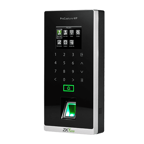 Display/Audio – Works without a computer. Complete setup and programing can be done via the ProCapture-WP keypad and embedded firmware. Audio-Visual Indication for acceptance and rejection of valid/invalid fingerprints, cards and passwords